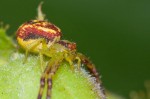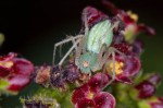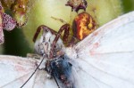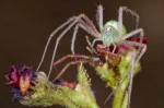 The bellyache bush has tiny flowers that are popular amongst nectar drinking insects like butterflies, bees and flies. But it’s a dangerous meal. They’re the best place to find crab spiders and lynx spiders. These spiders typically wait near on or near the flowers to attack unsuspecting insects. The crab spider in particular is often extremely well camouflaged. As you can see from one of the photos, though, that camouflage is not always good enough to keep it from being eaten by a lynx spider. (One photo was taken on coralita/Mexican creeper flowers, and the crab spider hiding on that flower adopts a slightly different coloration.)