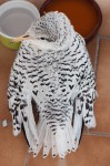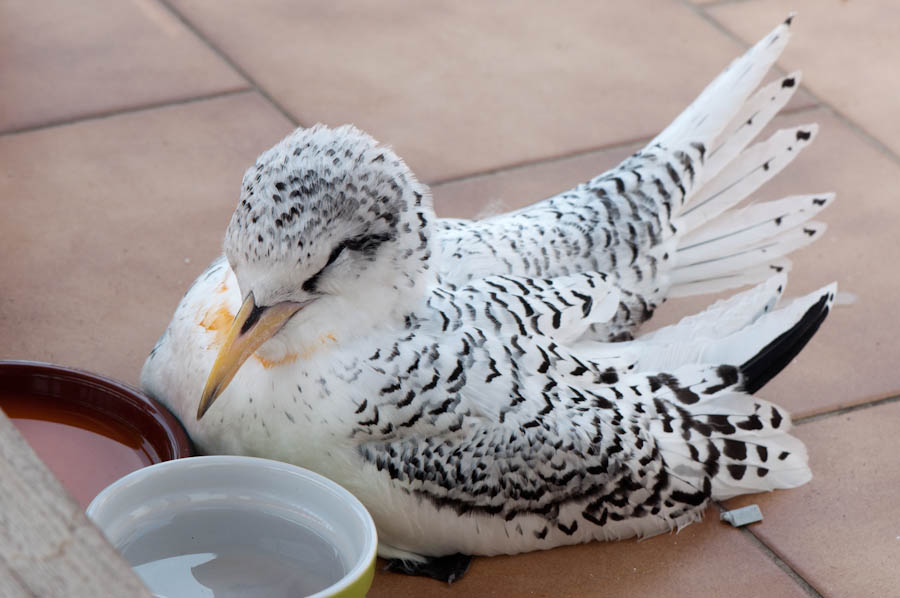 Our neighbor, Oswen from Caribbean Paddling, rescued an immature tropicbird that was stranded at Orient Beach, unable to fly. It’s resting in the shade at the moment until he can bring it to the vet’s office when it opens up after lunch. As you can see, this bird doesn’t have its distinctive, long tail feathers yet. I am guessing that it is a red-billed tropicbird, since those are much more common around here, but apparently the immature white-tailed tropicbird is also very similar in appearance. Feel free to tell me which one it is.